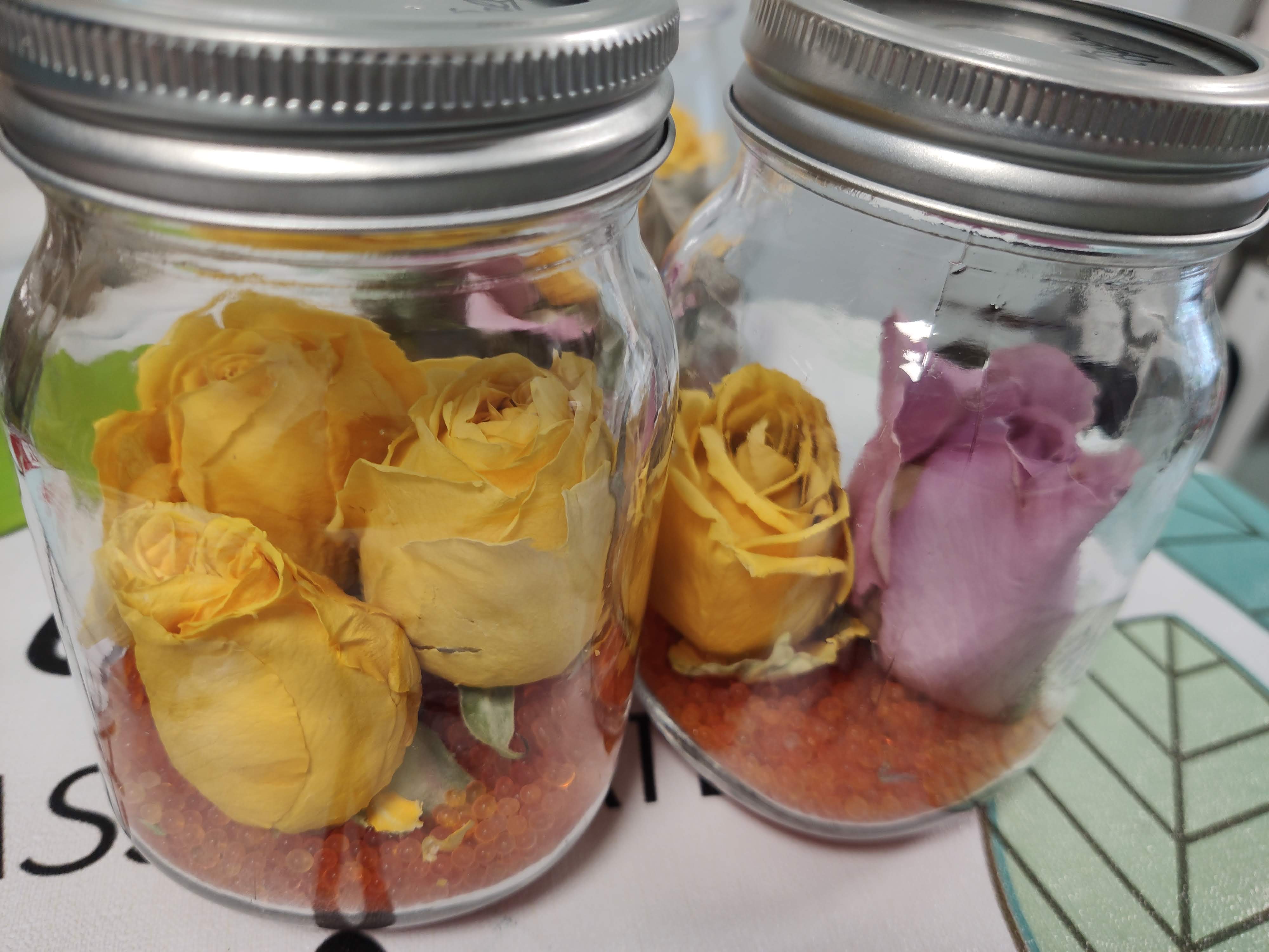 美國的HarvestRight由於預設程序不適合,不能用作乾燥鲜花用;只能以中國造乾燥機進行,預冷10小時至-40度C,在負壓(1-18Pa)下缓慢升層板温度,運行48小時(因花朵偏大及厚重,需增長時間)。结果如上圖以黄色保存最佳,红色效果不佳,但於早前一次檢視美國vs中國機器及乾躁時間效果時,發覺"無忘我"保色效果非常好,因此這會否与花種及大小有關?將於之後更多實驗後累積進—步了解!Aim to maintain the pigments and outlook of the dry flowers, after two trials, I conclude the “HarvestRight” freeze dryer build-in default program is not suitable for flowers drying while the China freeze-dryer machine got excellent result. Recipe setting for flower is the pre-cooling setting of -40℃ for 10 hours and a negative pressure (1-18Pa). Upmost temperature is 35℃ and need 48 hours or more, depending on the size and color of the flower. Further experiment is need. No obvious color changes observed after months of storage under glassware jar.