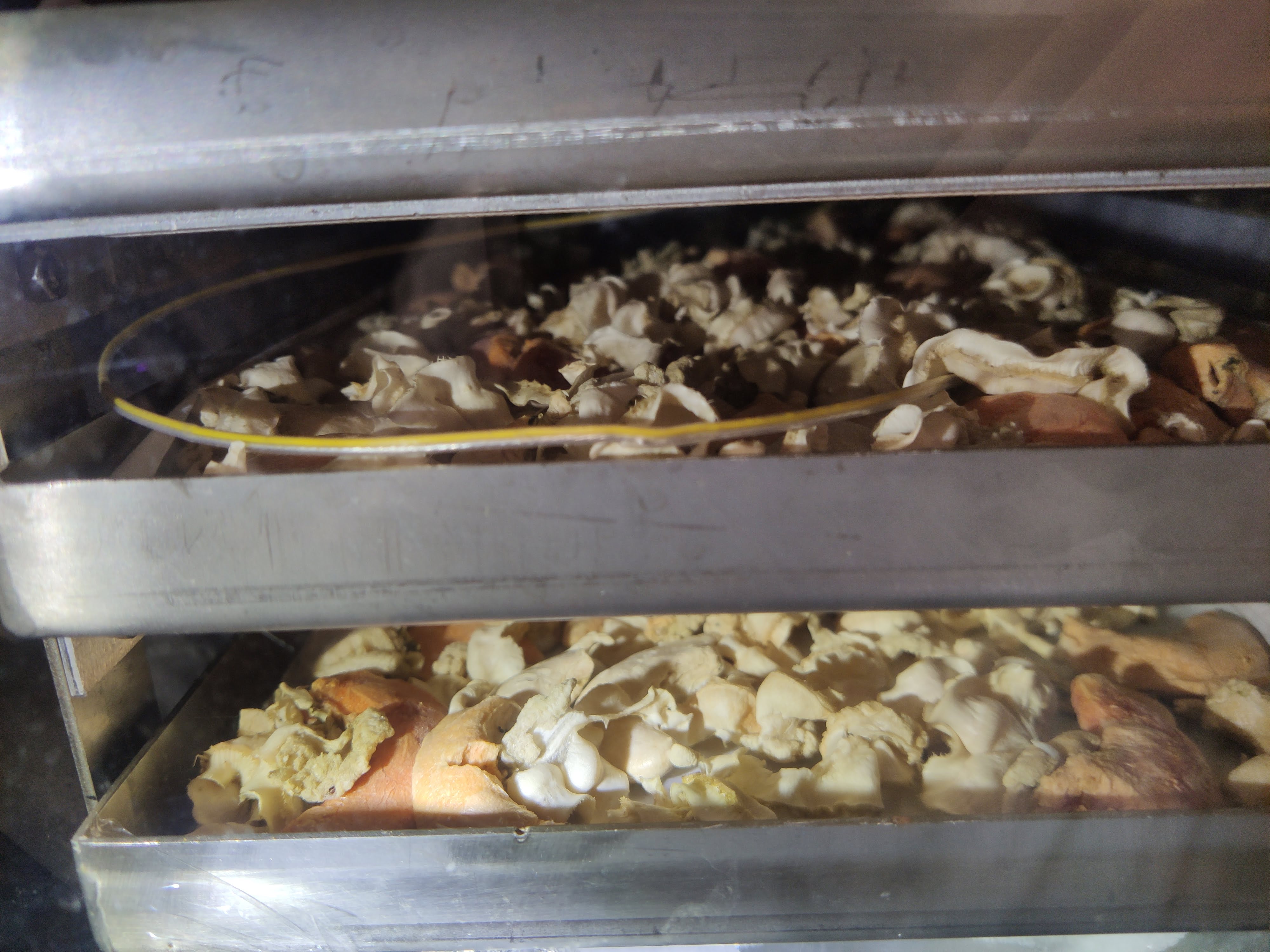 以中國造乾燥機進行,預冷10小時至-40℃,在負壓(5-10Pa)下缓慢升層板温度,分10流程運行28.5小時(因扇貝不大,所需時間缩短),主乾階段温度55℃。结果如上圖保存良好,復水1分鐘肉質口感回復九成!In order to maximize the best result upon the taste and outlook of fresh fanscallops, prefer to apply the China freeze-dryer as to get accessible drying recipe. Recipe starts from the pre-cooling of -40℃ for 10 hours and a negative pressure (5-10Pa). The whole recipe is 28.5 hours and is divided for 10 sections. Upmost temperature is 55℃ for the main sublimation process. No obvious color neither nor appearance changes observed and restore to 90% within 1 minute when water supplied.