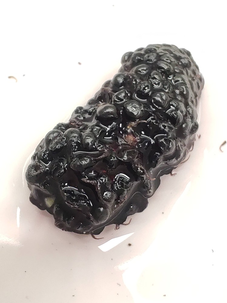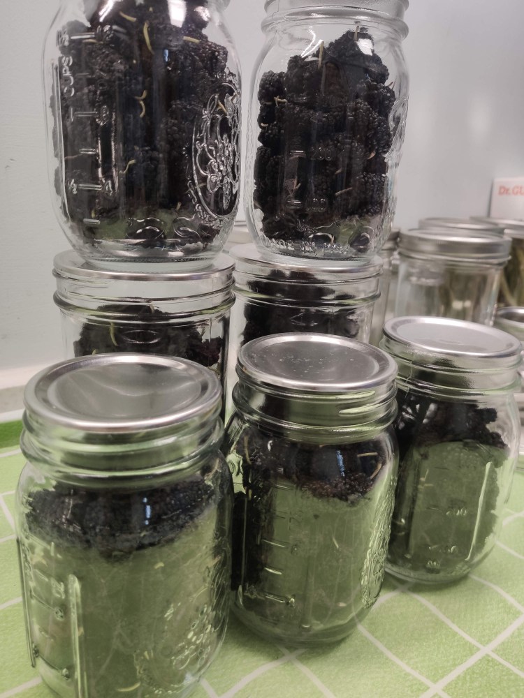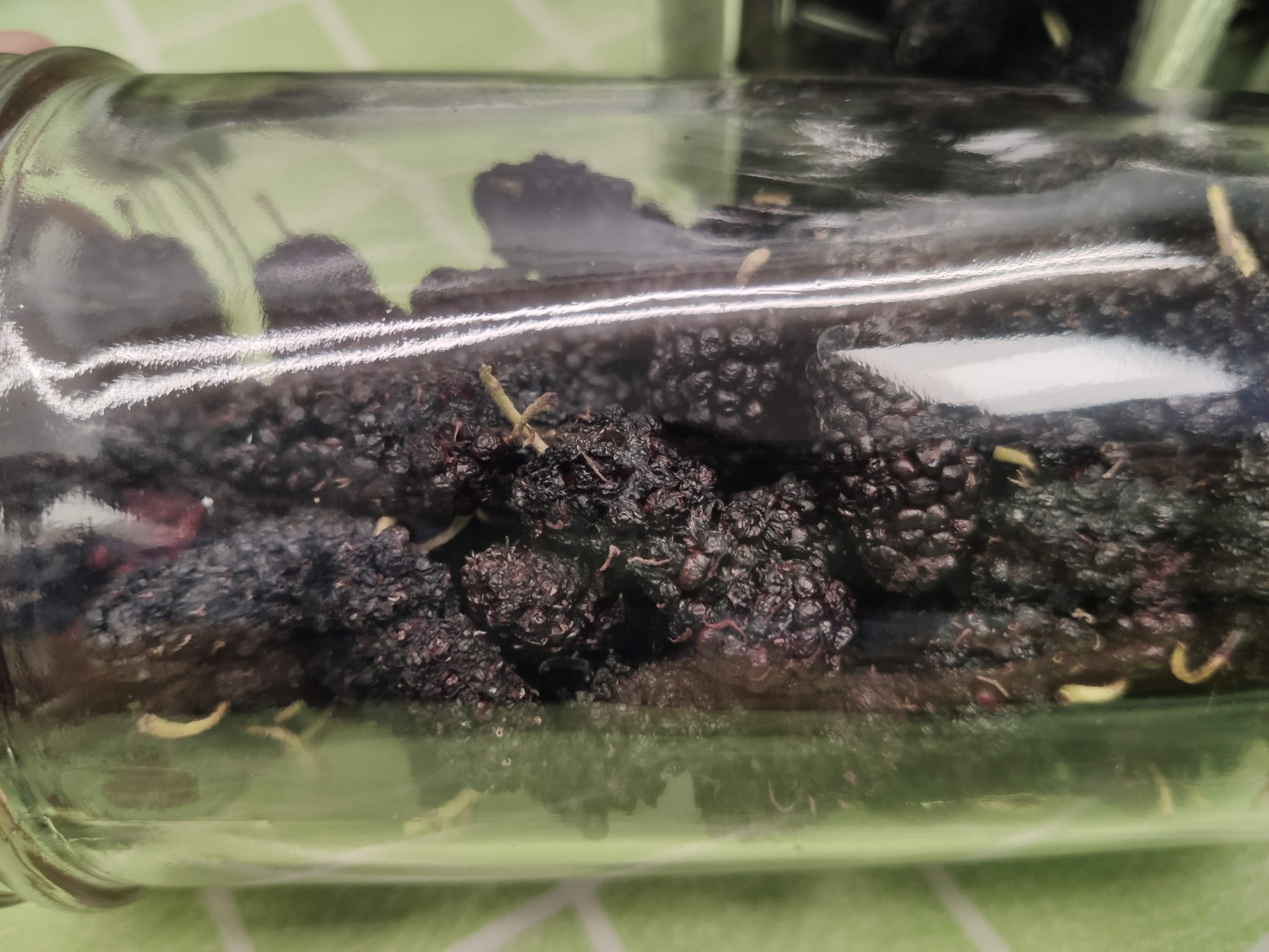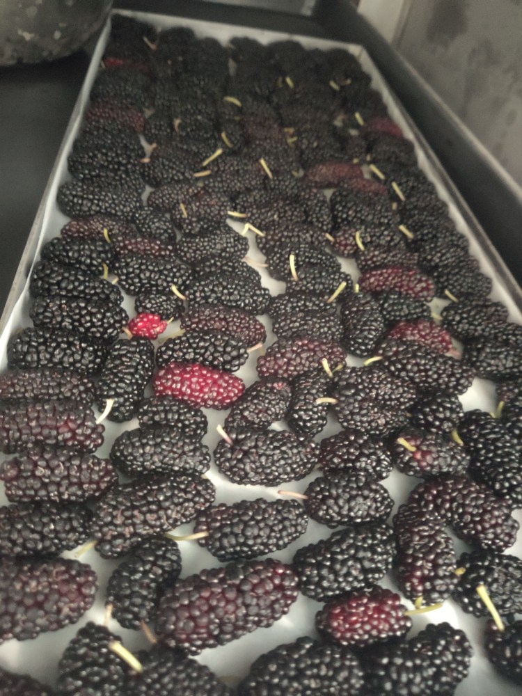 以中國造乾燥機進行,預冷10小時至-35℃,在負壓(~10Pa)下缓慢升層板温度,分20流程運行2天(因希望外觀保持,隔板升温缓慢,所需時間加長),主乾階段温度40℃。结果如上圖,保存不理想。In order to maximize the best result upon the outlook of mulberry, prefer to apply the China freeze-dryer as to get accessible drying recipe. Recipe starts from the pre-cooling of -35℃ for 10 hours and a negative pressure (~10Pa). The whole recipe is 2 days and is divided for 20 sections. Upmost temperature is 40℃ for the main sublimation process. No obvious color change but the appearance retention is not satisfactory.