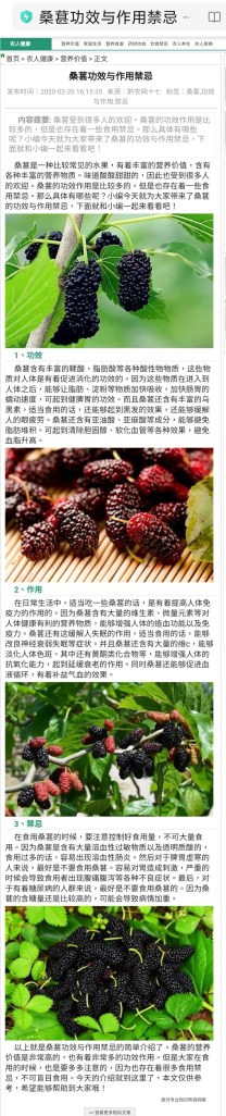 桑果的顏色來自花青素,對人體沒有已知作用。花色苷使新鮮的植物性食品具有誘人的色彩,其中包括橙色,紅色,紫色,黑色和藍色。這些顏色是水溶性的,易於提取,可產生天然食用色素。由於對天然食用色素的需求不斷增長,它們在食品工業中得到了廣泛的應用。